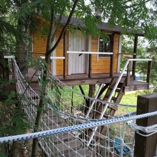 Опорами для этой симпатичной постройки в подмосковном Леоново служат высокие березы. Они поддерживают не только домик, но и смотровую площадку на одной из них. Попасть на площадку можно через подвесной мостик, ведущий от открытой террасы домика. Для детских игр и тусовок лучшего места не придумаешь. Хорошо здесь побыть и одному - личное пространство, достаточно обособленное от остального мира, очень важно для ребенка. Домик отлично приспособлен для других занятий, например, для популярного сейчас наблюдения за птицами (для этого подходит смотровая площадка), совместных посиделок и тихих игр.