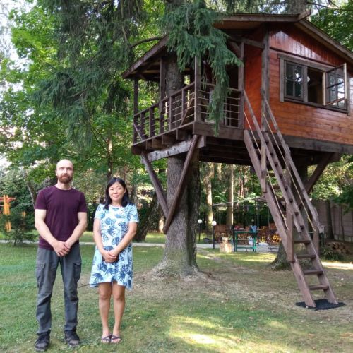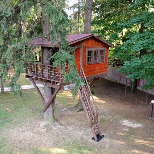 Просторный участок в деревне Переделки в Подмосковье - идеальное место для строительства домика на дереве. Постройка получилась классической - с опорой на стволы двух могучих елей, один из которых проходит через широкую открытую террасу, с большим трехстворчатым окном по фасаду. Здесь нет висячих мостиков, смотровых площадок, качелей, горок - все эти необходимые атрибуты детских игр на воздухе размещаются в других частях территории, благо ее размеры позволяют. Такой домик обеспечивает так нужное всем, особенно детям, чувство обособленности, защищенности, осознание личных границ.