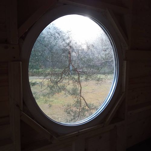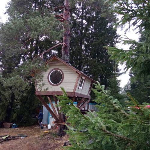 Строительство домика с круглым окном на дереве в Рощино