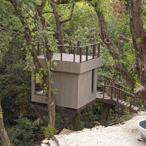 Домик на деревьях - прежде всего место уединения и пространство для детских игр, поэтому масштабы постройки эксцентричного американца вряд ли подойдут большинству из нас. В центральных и в северных регионах России самыми распространенными породами деревьев являются сосна, ель и береза, поэтому строительство домика на дубах ведется в основном на юге, где дуб и другие широколиственные породы растут в изобилии. Примером является проект нашей компании, реализованный в черногорском местечке Мойдеж на Адриатике. Домик находится в густом лесу на склоне горы. Его поддерживают несколько дубов местной породы. Домик совсем небольшой, с открытой площадкой на крыше, с которой открывается чудесный вид на окружающий лес и морской берег.