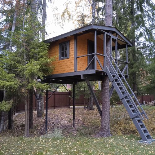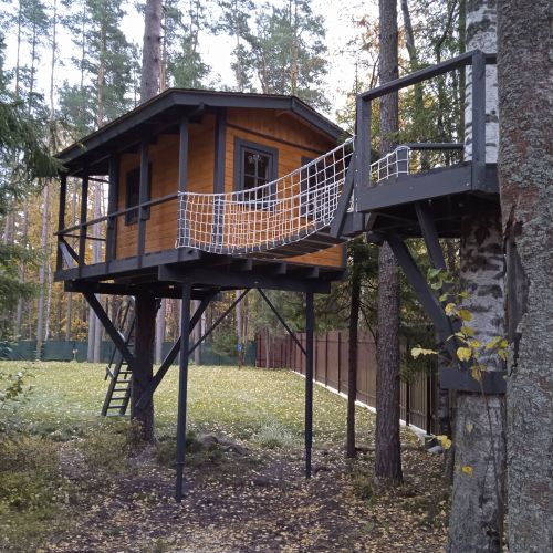 Домик в коттеджном поселке Комарово-2 - воплощенная детская мечта. Висячий мостик к наблюдательному пункту на старой березе - толчок к созданию самых невероятных игр. Впрочем, насладиться этой замечательной вещью могут и взрослые, тем более что подъем легок и безопасен: входная лестница снабжена перилами, а висячий мостик - надежной защитной сеткой. В дождливую погоду можно расположиться на открытой террасе у входа и любоваться чудесным видом хвойного леса. В домике вполне можно коротать приятные часы в компании или одному и даже расположиться на ночлег. Постройка закреплена на одной из елей, растущих на участке. Дополнительно ее удерживают две металлические опоры.