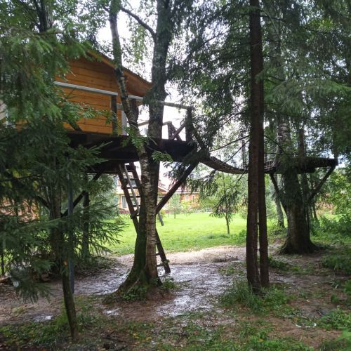 Опорами для этой симпатичной постройки в подмосковном Леоново служат высокие березы. Они поддерживают не только домик, но и смотровую площадку на одной из них. Попасть на площадку можно через подвесной мостик, ведущий от открытой террасы домика. Для детских игр и тусовок лучшего места не придумаешь. Хорошо здесь побыть и одному - личное пространство, достаточно обособленное от остального мира, очень важно для ребенка. Домик отлично приспособлен для других занятий, например, для популярного сейчас наблюдения за птицами (для этого подходит смотровая площадка), совместных посиделок и тихих игр.