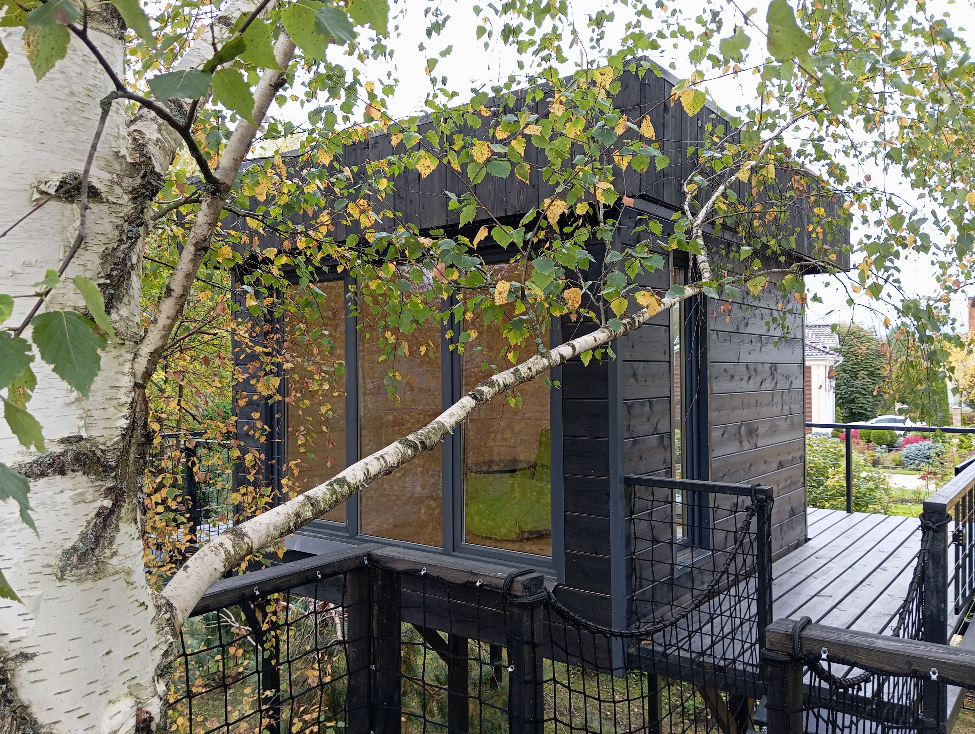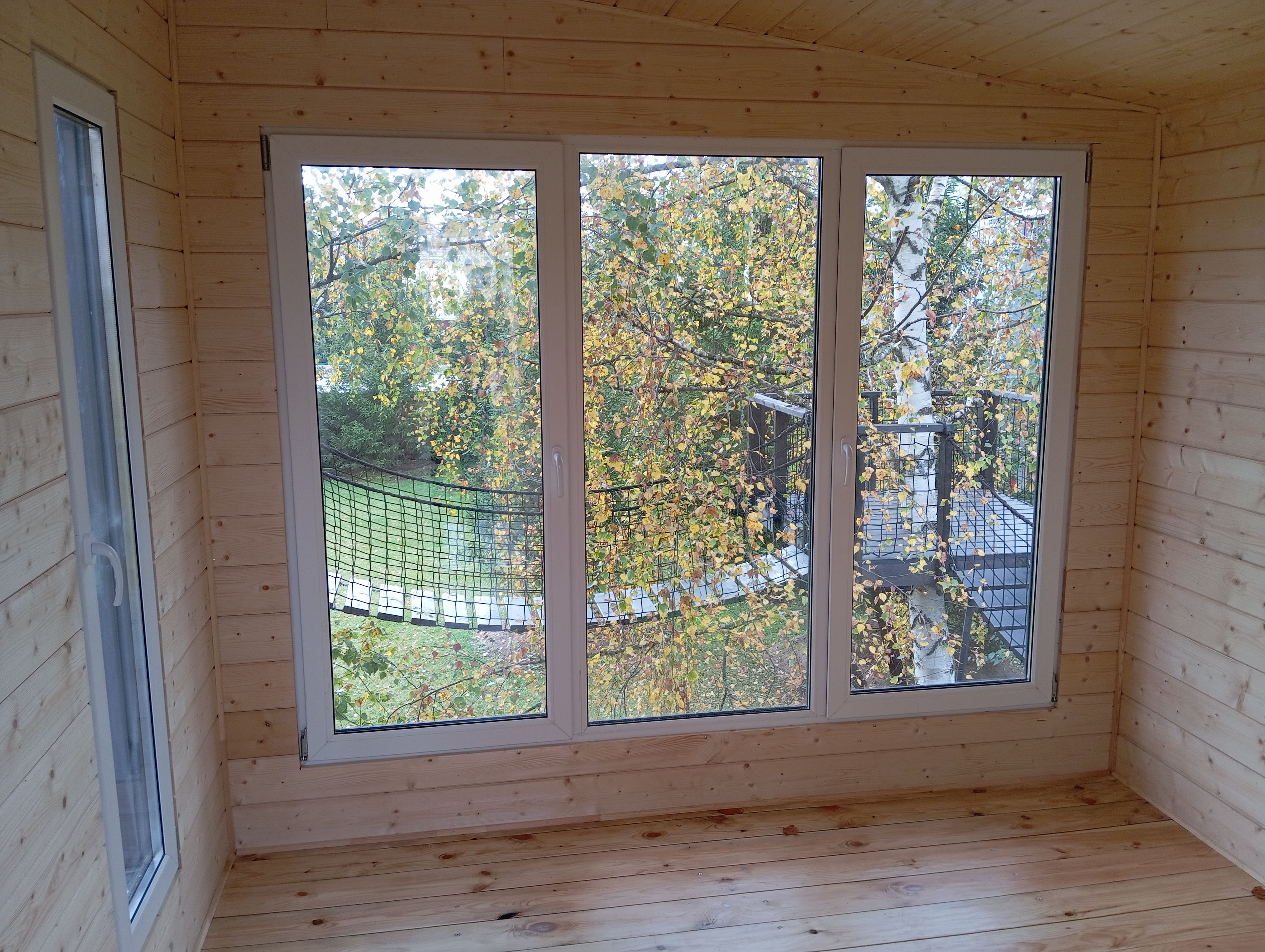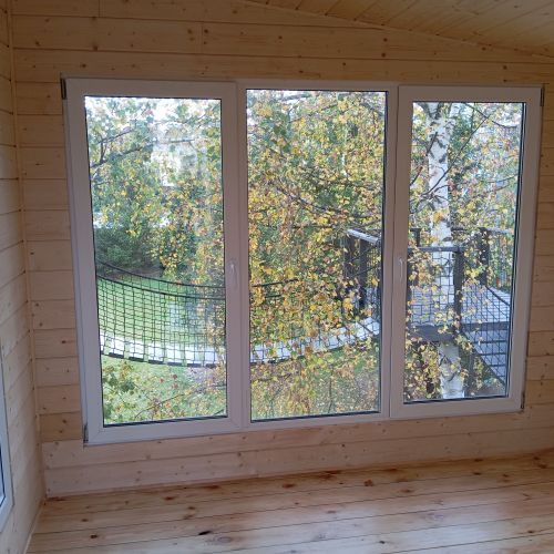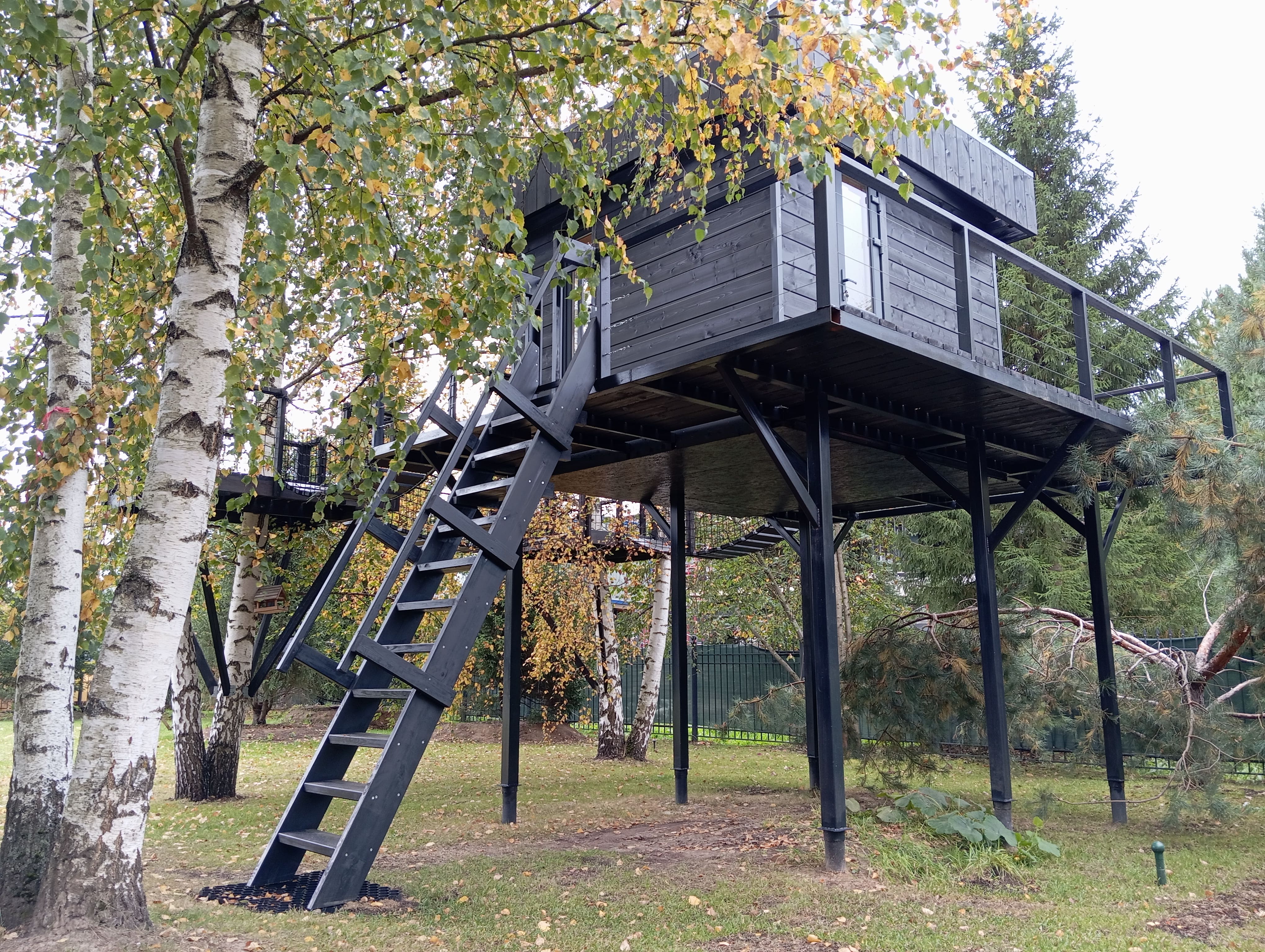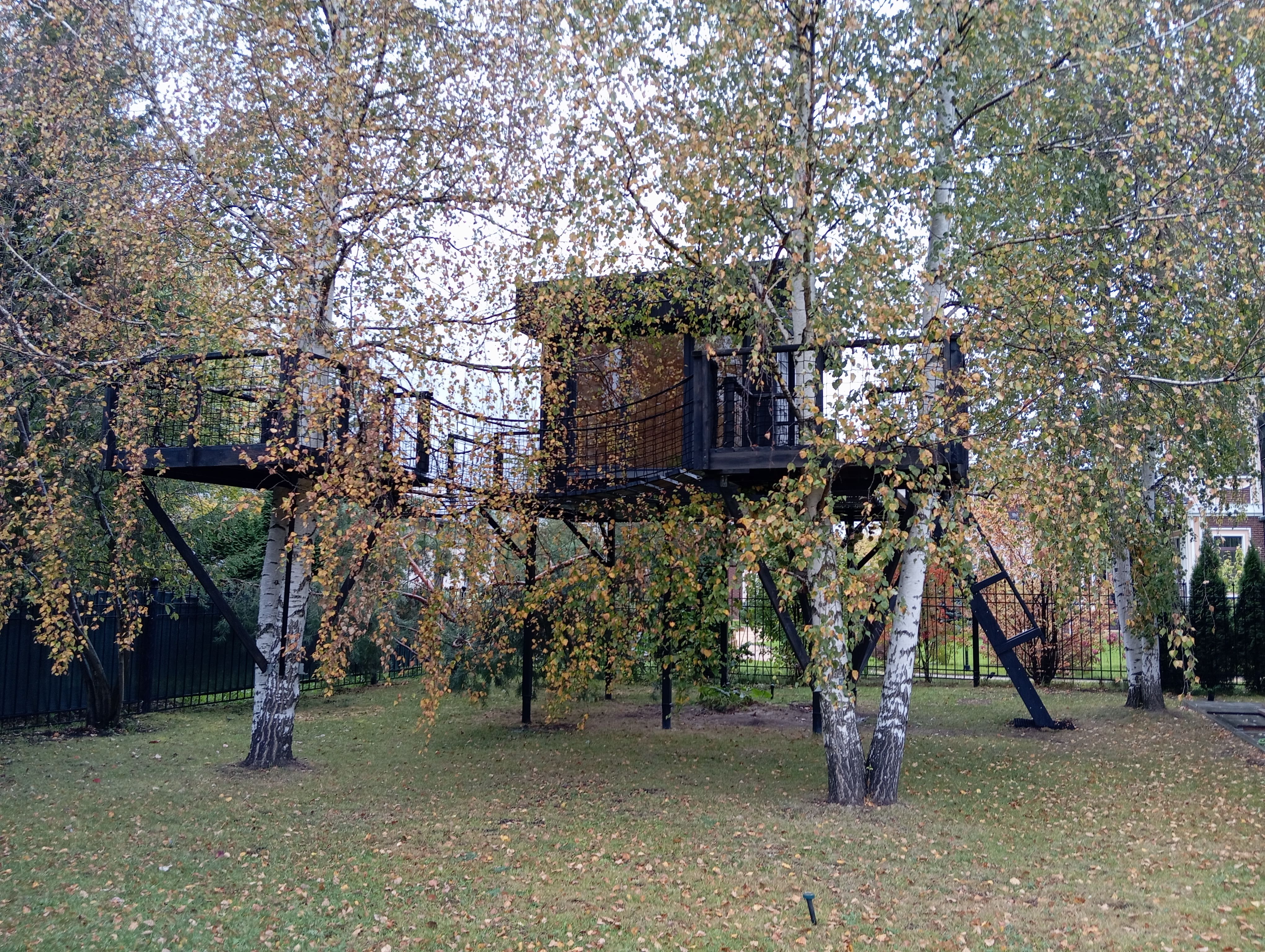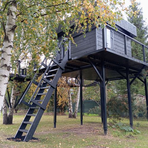 На 6 опорах закреплен домик с круговым проходом через мостики по платформам на березах. Домик утеплен, что позволяет проводить в нем время круглогодично. Домик имеет панорамное окно, а также калитку с замком от непрошенных гостей.