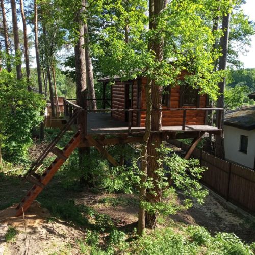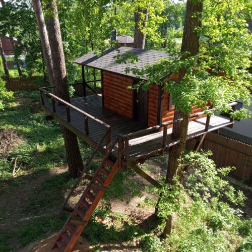 Этот домик надежно закреплен на трех вековых соснах, дополнительных опор для его строительства не потребовалось. С обширной террасы открывается замечательный обзор местности. Много столетий назад подобная постройка послужила бы дозорной вышкой крепости. Домик, как и главное здание усадьбы, сложен из бруса, что также приближает его образ к древним защитным сооружениям: на Руси, богатой лесом, крепости возводили из бревен. Постройка идеально вписывается в окружающий пейзаж, почти сливаясь с ним. Эта задача, стоящая перед многими архитекторами, проектирующими загородные дома, здесь решена блестяще.