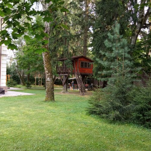 Просторный участок в деревне Переделки в Подмосковье - идеальное место для строительства домика на дереве. Постройка получилась классической - с опорой на стволы двух могучих елей, один из которых проходит через широкую открытую террасу, с большим трехстворчатым окном по фасаду. Здесь нет висячих мостиков, смотровых площадок, качелей, горок - все эти необходимые атрибуты детских игр на воздухе размещаются в других частях территории, благо ее размеры позволяют. Такой домик обеспечивает так нужное всем, особенно детям, чувство обособленности, защищенности, осознание личных границ.