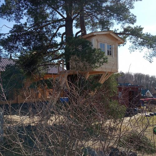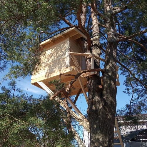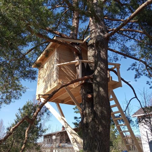 У сосны, на которой установлен этот домик в поселке Токсово под Петербургом, целых три ствола. В Токсово с его гористым рельефом (эту местность называют петербургской Швейцарией) много таких мощных деревьев, растущих на открытых солнечных пригорках. Наклонные балки, поддерживающие основание постройки, крепятся к самому мощному стволу до его разветвления, один из стволов проходит сквозь крышу домика. Система балок надежно удерживает постройку на одной сосне, дополнительных опор не требуется. Само дерево чувствует себя прекрасно, хотя, казалось бы, крепления нескольких откосов должны травмировать ствол, - все дело в квалификации и опыте строителей.